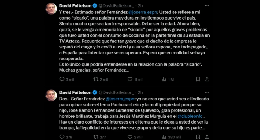 Recordemos que, a principios de mes, Faitelson publicó una serie de tuits en los que revivió el pasado de José Ramón Fernández con las adicciones. Sin mencionar que puso sobre la mesa su conflicto de intereses para opinar sobre el tema de Pachuca y León, ya que su hijo trabaja en el Club León, algo que le impediría ver "la ilegalidad en la que vive ese grupo y de la que su hijo es parte".