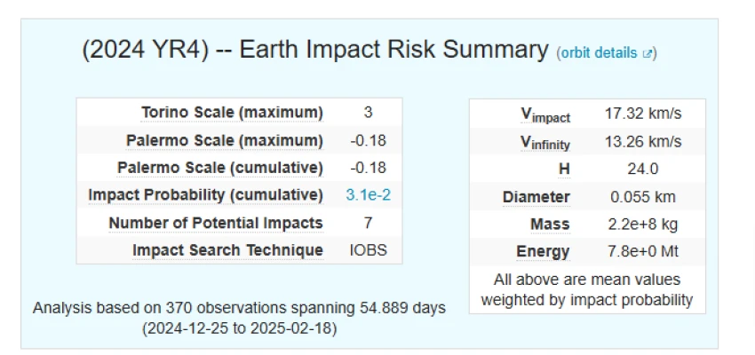 En la escala de Turín, utilizada para clasificar el peligro de impacto de los objetos cercanos a la Tierra, el asteroide 2024 YR4 tiene un nivel 3 de 10, lo que lo convierte en una amenaza mayor que la mayoría de los objetos espaciales, que suelen clasificarse en nivel 0.