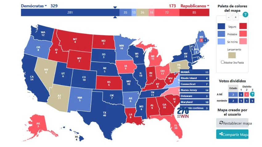 Según el mapa electoral de 270ToWin, ambos candidatos deberán asegurar al menos 270 votos del Colegio Electoral para ganar la presidencia en 2024. Hasta el momento, el Partido Demócrata cuenta con 226 votos proyectados y el Partido Republicano con 219.