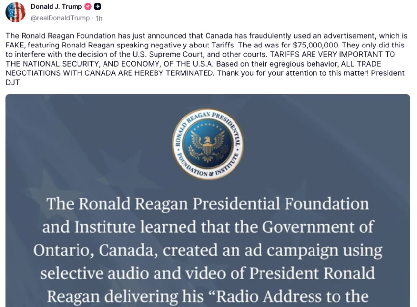 A través de su cuenta de Truth Social, Donald Trump explicó que la Fundación Ronald Reagan señaló que Canadá "utilizó fraudulentamente" un anuncio falso en el que el ex presidente “habla negativamente sobre los aranceles. El anuncio era por 75 millones de dólares. Lo hicieron solo para interferir en la decisión de la Corte Suprema de Estados Unidos y otros tribunales”, afirmó.