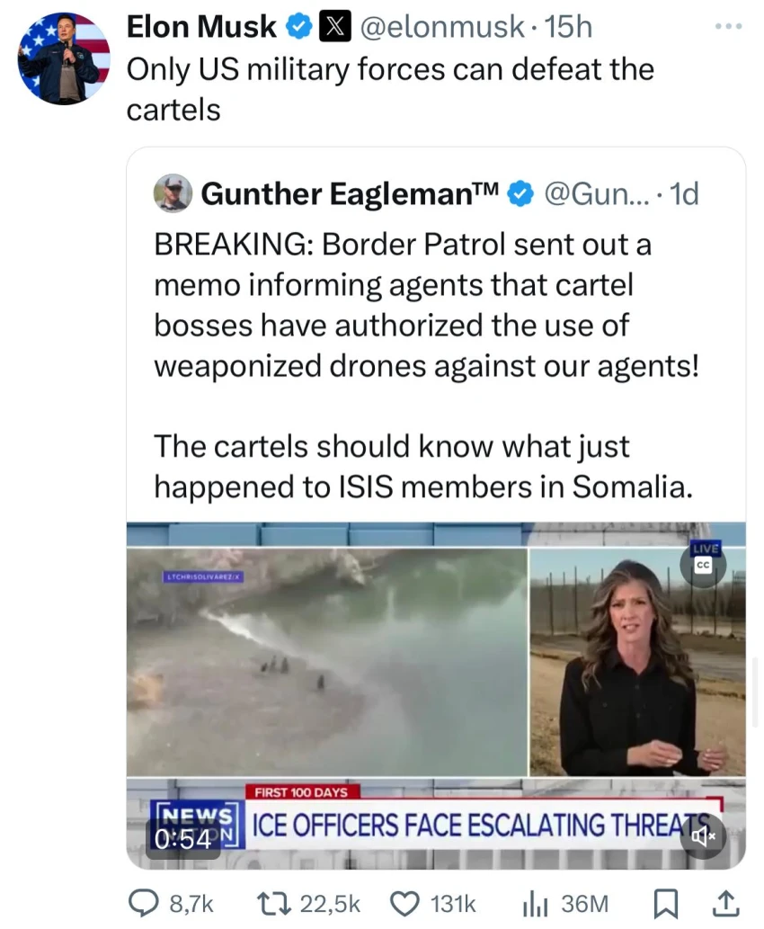 Ante este escenario, el empresario Elon Musk, fiel seguidor del presidente Trump, desató una polémica, comentar a manera de burla un post en redes sociales que hace apelación a las negaciones de la presidenta de vínculos con el crimen organizado y otorgó un emoji con cara de “morirse de risa”.