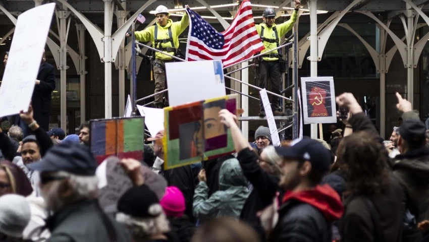 En Nueva York, la lluvia no impidió que unas mil personas recorrieran los alrededores de Bryant Park, en pleno Manhattan, con banderas palestinas y LGTBI, acompañadas de pancartas con consignas como "Quita las manos de nuestros empleos" o "Ningún ser humano es ilegal".