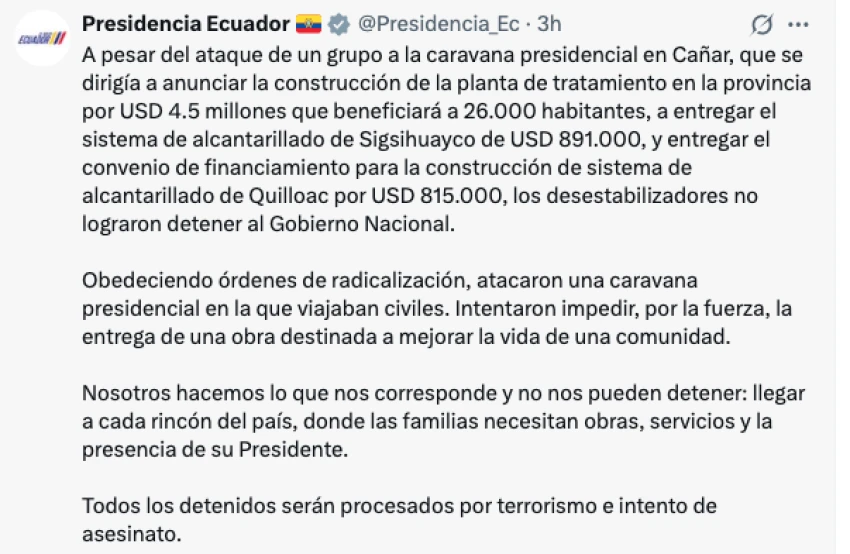 "A pesar del ataque de un grupo a la caravana presidencial en Cañar, que se dirigía a anunciar la construcción de la planta de tratamiento en la provincia por USD 4.5 millones que beneficiará a 26.000 habitantes, a entregar el sistema de alcantarillado de Sigsihuayco de USD 891.000, y entregar el convenio de financiamiento para la construcción de sistema de alcantarillado de Quilloac por USD 815.000, los desestabilizadores no lograron detener al Gobierno Nacional".
