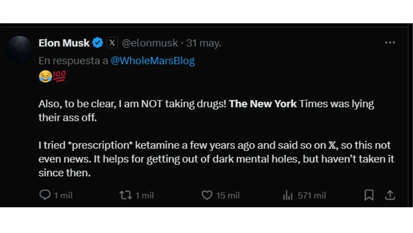 Tras la publicación del artículo de The New York Times, Musk negó el 31 de mayo rotundamente los señalamientos. “Para ser claro: ¡NO estoy consumiendo drogas! El New York Times está mintiendo descaradamente”, escribió el 31 de mayo en su cuenta de X.