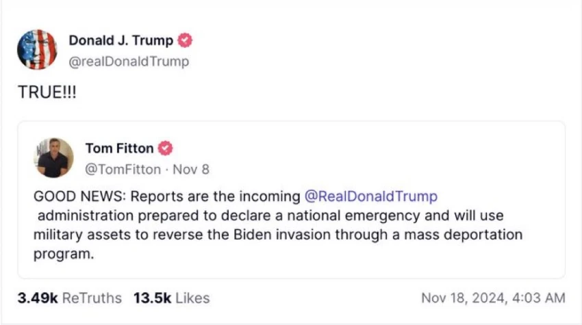En su mensaje, Fitton aseguró que Trump estaba preparado para declarar una emergencia nacional y utilizar activos militares para implementar un programa de deportaciones masivas. Esta respuesta refuerza una de las principales promesas de campaña del magnate, quien reiteró durante su candidatura su intención de endurecer las políticas migratorias en el país.
