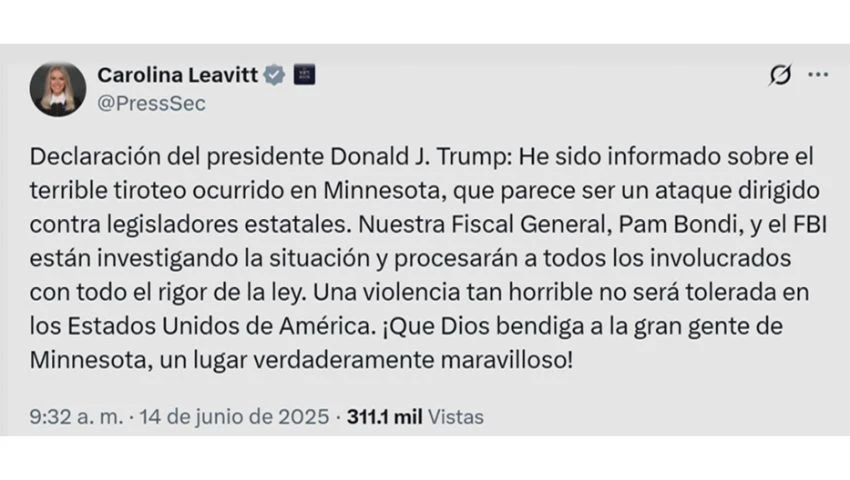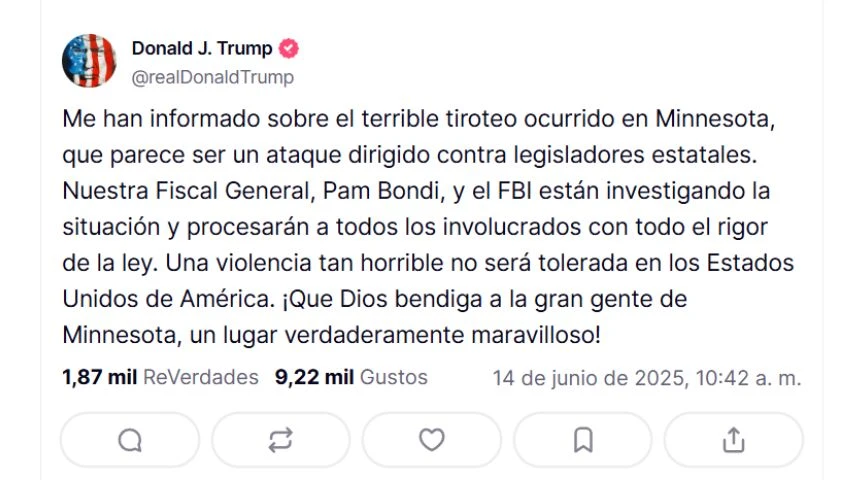 "Me han informado sobre el terrible tiroteo ocurrido en Minnesota, que parece ser un ataque dirigido contra legisladores estatales. Nuestra Fiscal General, Pam Bondi, y el FBI están investigando la situación y procesarán a todos los involucrados con todo el rigor de la ley. Una violencia tan horrible no será tolerada en los Estados Unidos de América. ¡Que Dios bendiga a la gran gente de Minnesota, un lugar verdaderamente maravilloso!".