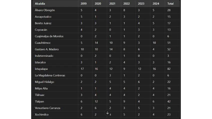 A continuación, se presenta una tabla detallada de las víctimas por alcaldía de 2019 a 2024: