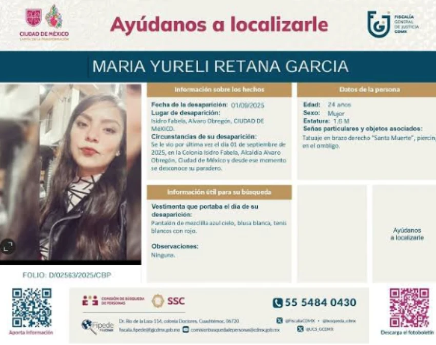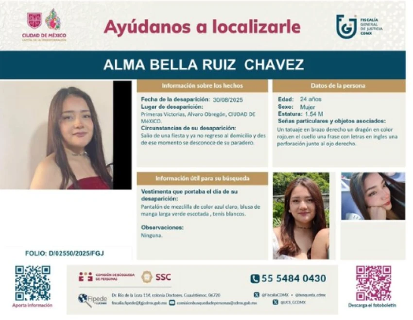 De acuerdo con la ficha de búsqueda emitida por la Fiscalía General de Justicia de la Ciudad de México, Alma Bella salió de la fiesta, pero jamás regresó a su domicilio. El día que desapareció, la joven vestía pantalón de mezclilla de color azul claro con una blusa de manga larga verde y tenis blancos.