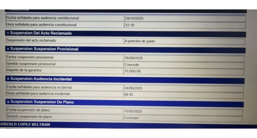 La jueza Verónica Beltrán Munguía, quien había asumido su cargo apenas un día antes, se declaró incompetente para seguir con el caso, ya que este tipo de recursos suelen corresponder a juzgados penales. No obstante, antes de remitirlo, concedió la suspensión de plano, medida inmediata que protege a los quejosos de cualquier captura fuera de procedimiento legal o sin orden escrita.