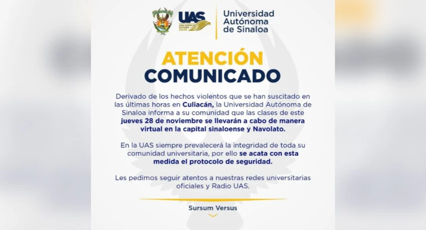 La violencia de las últimas horas ha obligado a diversas universidades de Culiacán, como la Universidad Autónoma de Sinaloa, a suspender clases presenciales y optar por el modelo en línea para salvaguardar la integridad de los estudiantes y docentes.