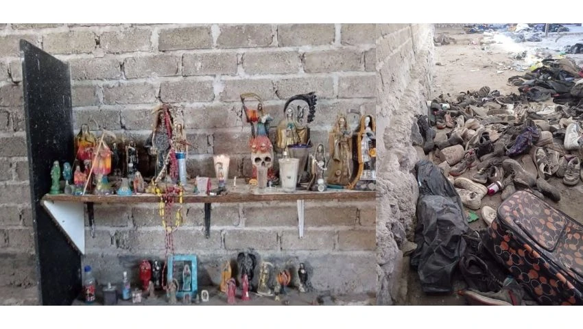 El sitio donde se encontraron los restos humanos y pertenencias está rodeado de tierra y rocas. Las construcciones son básicas, con paredes de ladrillo sin pintar y un aspecto de obra negra. En su interior hay pequeños muebles y altares dedicados a la Santa Muerte.