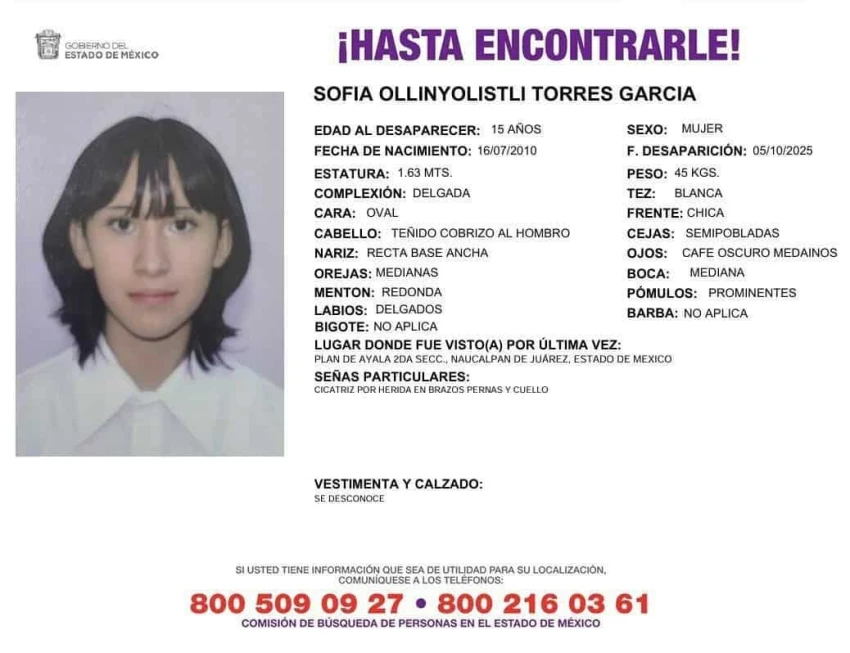 La Comisión de Búsqueda de Personas del Estado de México (COBUPEM) activó una ficha de búsqueda para localizar a Sofía Ollinyolistli Torres García, una adolescente de 15 años vista por última vez el 5 de octubre de 2025 en la colonia Plan de Ayala 2da Sección, en el municipio de Naucalpan de Juárez.