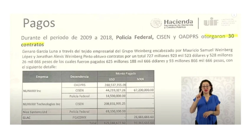Según la UIF, entre 2009 y 2018, durante los sexenios de Felipe Calderón y Enrique Peña Nieto, el Grupo Weinberg —vinculado directamente a García Luna— firmó 30 contratos por un total de 727 millones 923 mil 523 dólares y 528 millones 26 mil 666 pesos. De esos contratos, se pagaron 625 millones 188 mil 666 dólares y 93 millones 866 mil 666 pesos a través de empresas fachada en México, Estados Unidos, Israel y paraísos fiscales como Barbados.