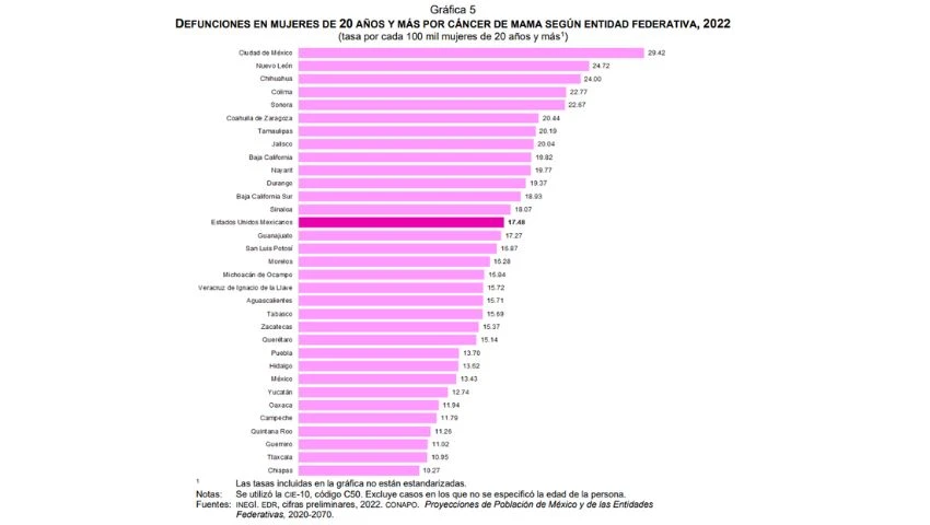 Las entidades con las tasas más altas de defunciones por cada 100,000 mujeres de 20 años y más, hasta el año 2022, son:
