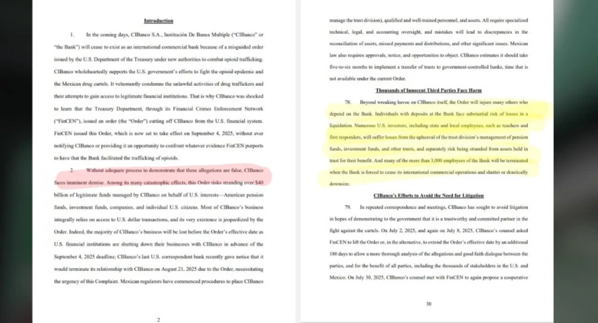 CIBanco presentó una demanda contra el Departamento del Tesoro de Estados Unidos tras ser señalado de facilitar operaciones de lavado de dinero para cárteles mexicanos, acusación que la institución financiera considera arbitraria y carente de pruebas.