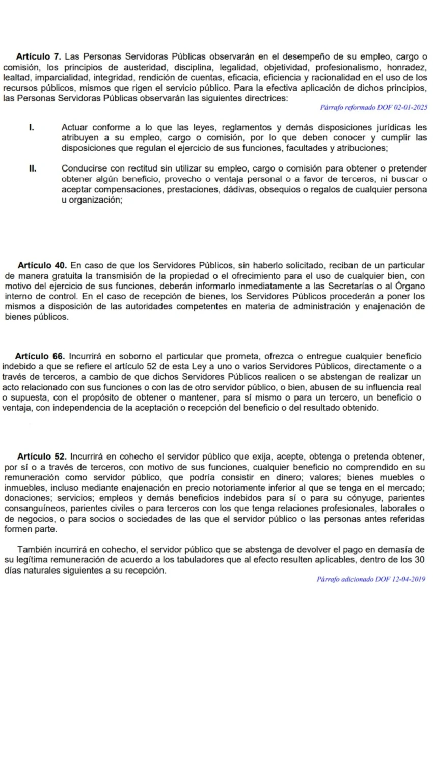 De acuerdo con los artículos 7 fracción II, 40, 52 y 66, cualquier obsequio recibido debe ser reportado o entregado a las autoridades competentes. De lo contrario, podría considerarse cohecho, un delito penado en la legislación mexicana.