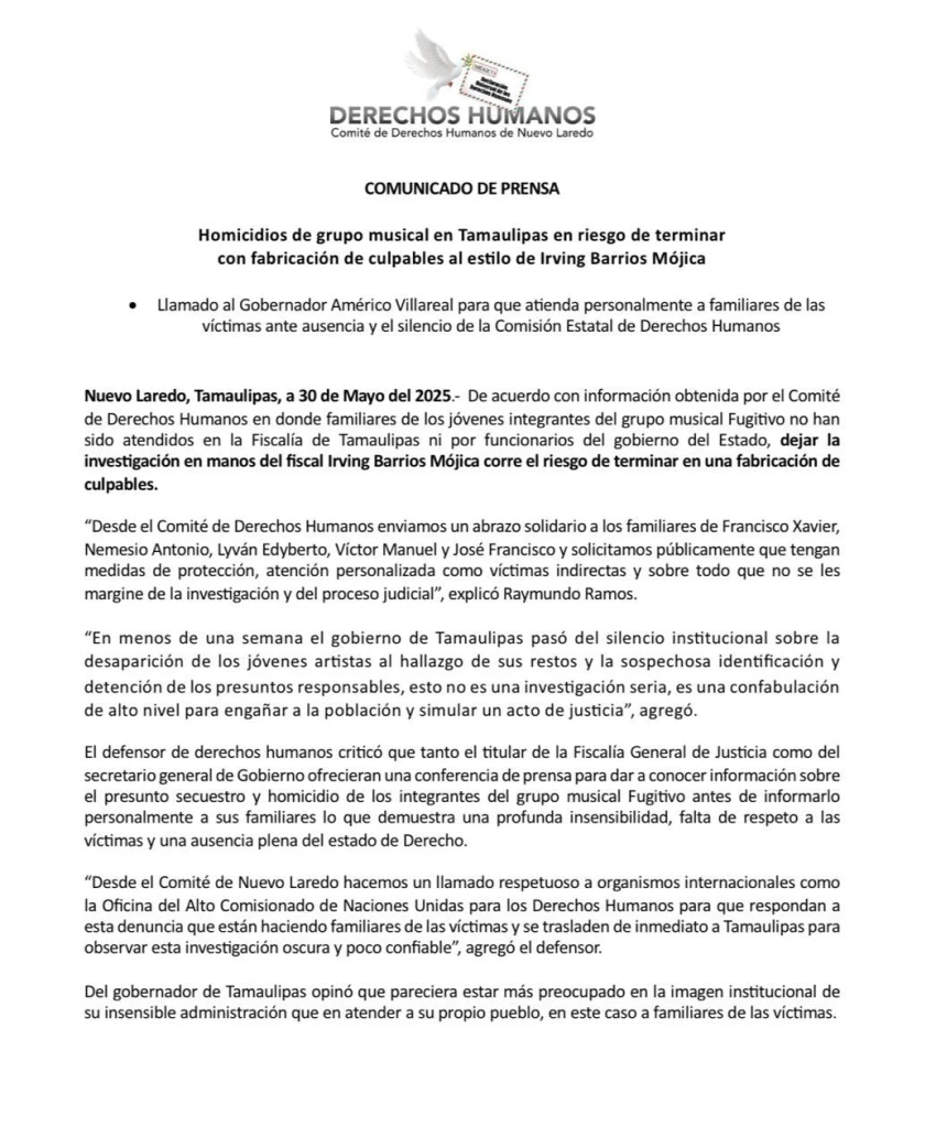Este viernes 30 de mayo, el Comité de Derechos Humanos de Nuevo Laredo emitió un comunicado de prensa asegurando que el caso de los integrantes del grupo musical Fugitivo, quienes fueron asesinados de acuerdo con la información de la Fiscalía de Tamaulipas, corre riesgo de que se fabriquen culpables.