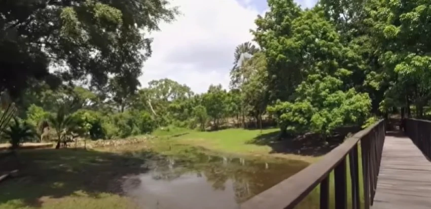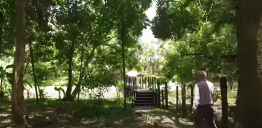 En el lugar hay una pequeña laguna, para cruzar hay un puente, el sitio está rodeado de árboles frutales y maderables, como cedros, los cuales mostró en el documental, con ellos “habla” cuando requiere reflexionar.