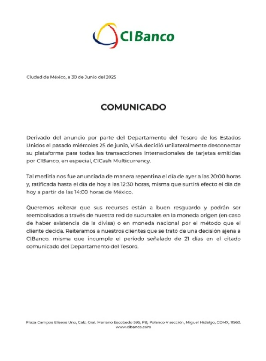 El domingo 29 de junio a las 20:00 horas, la empresa VISA notificó a CIBanco sobre la suspensión de todas sus transacciones internacionales. La medida fue ratificada el lunes 30 de junio a las 12:30 horas y entró en vigor a las 14:00 horas de ese mismo día. CIBanco confirmó en un comunicado que esta decisión afecta principalmente a su tarjeta CICash Multicurrency.