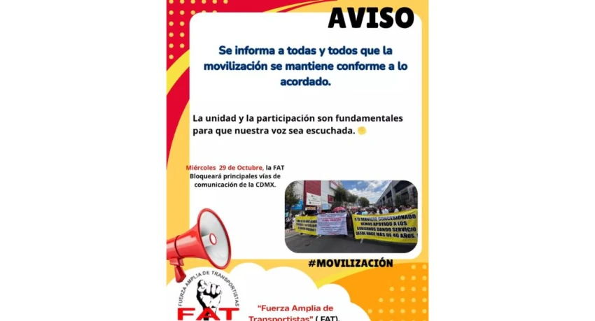 La Ciudad de México se prepara para una jornada de movilidad crítica este miércoles 29 de octubre de 2025, cuando la Fuerza Amplia de Transportistas (FAT) lleve a cabo un megabloqueo simultáneo en diversas vialidades de la capital.
