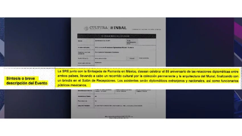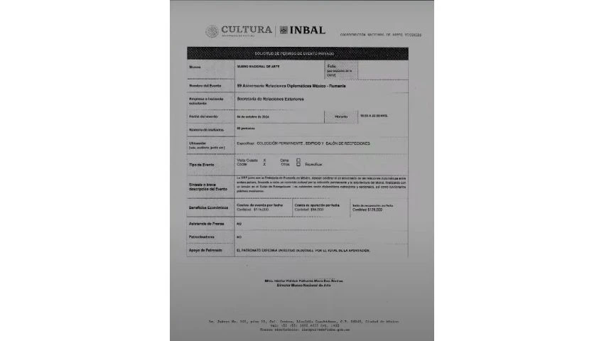 Claudio Ochoa Huerta compartió el documento de solicitud de permiso para realizar el vento en el MUNAL, bajo la excusa del evento diplomático por Rumania y México, asimismo, destacó el apartado de beneficios económicos: