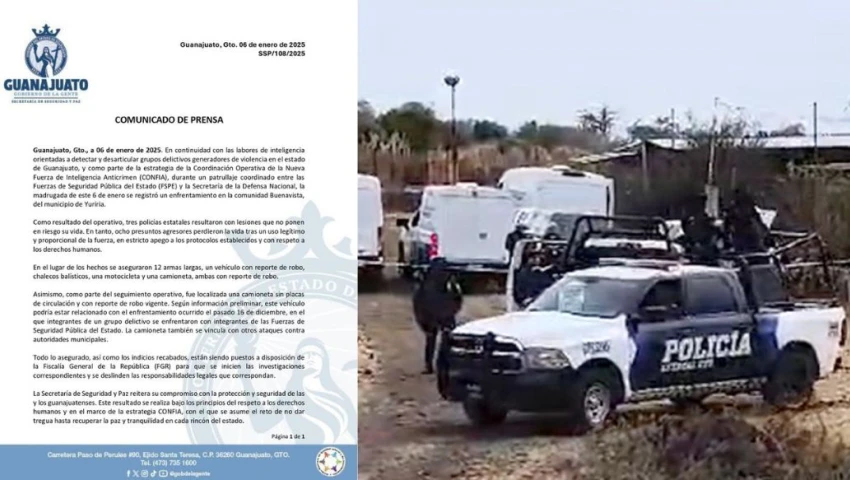Un enfrentamiento armado ocurrido en la madrugada del 6 de enero de 2025 en la comunidad de Buenavista, Yuriria, Guanajuato, dejó un saldo de ocho presuntos delincuentes abatidos y tres policías estatales heridos.