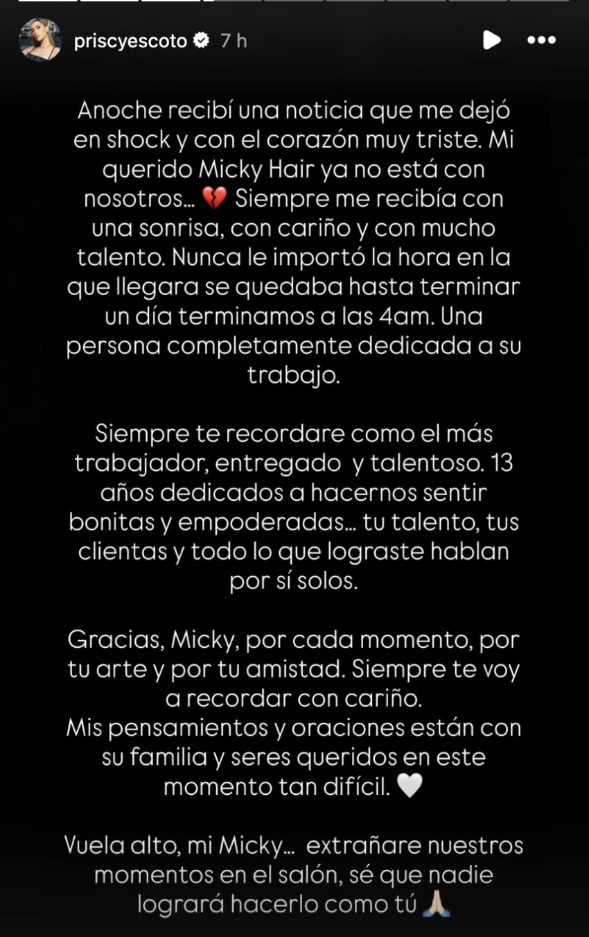 "Una persona completamente dedicada a su trabajo. Siempre te recordaré como el más trabajador, entregado y talentoso. 13 años dedicados a hacernos sentir bonitas y empoderadas (...) tu talento, sus clientas y todo lo que lograste hablan por sí solos. Gracias, Micky, por cada momento por tu arte y por tu amistad. Siempre te voy a recordad con cariño. Mis pensamientos y oraciones están con su familia y seres queridos en este momento tan difícil. Vuela alto, mi Micky (...) extrañaré nuestros momentos en el salón, sé que nadie logrará hacerlo como tú”, escribió la creadora de contenido en sus redes.