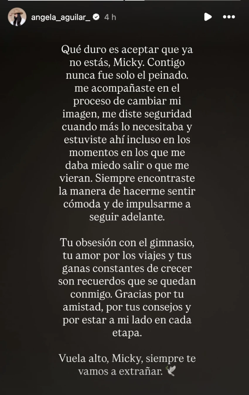 “Qué duro es aceptar que ya no estás, Micky. Contigo nunca fue solo el peinado. Me acompañaste en el proceso de cambiar mi imagen, me diste seguridad cuando más lo necesitaba y estuviste ahí incluso en los momentos en los que me daba miedo salir o que me vieran. Siempre encontraste la manera de hacerme sentir cómoda y de impulsarme a seguir adelante", señaló la cantante en sus redes.