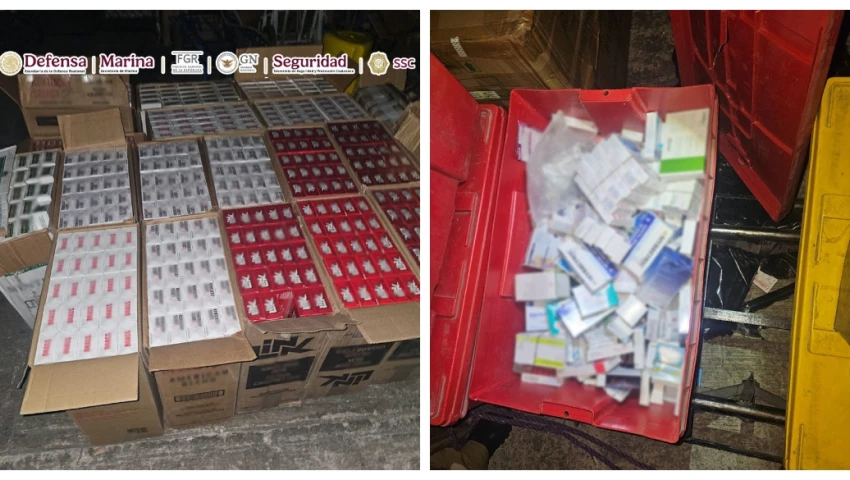 Durante la intervención, se aseguraron aproximadamente un millón y medio de cigarrillos de 65 marcas diferentes, 1,200 pares de tenis, 2,100 cajas de medicamentos controlados, 900 vapeadores con posible cannabis, así como un arma de fuego corta.