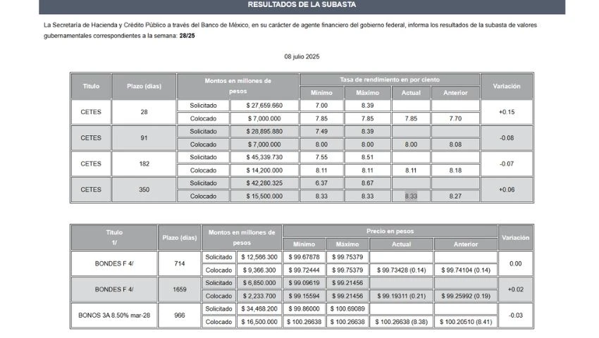 Tasas de rendimiento de Cetes al 8 de julio de 2025