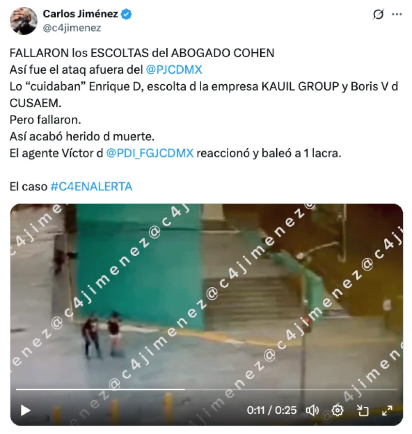 Luego el ataque, se observa a los escoltas identificados como Enrique “D” y Boris “V”, cuando reaccionaron demasiado tarde para evitar que el abogado fuera herido, además de no perseguir de inmediato al agresor quien fue neutralizado por un policía de investigación, según reveló la Secretaría de Seguridad Ciudadana de la Ciudad de México.