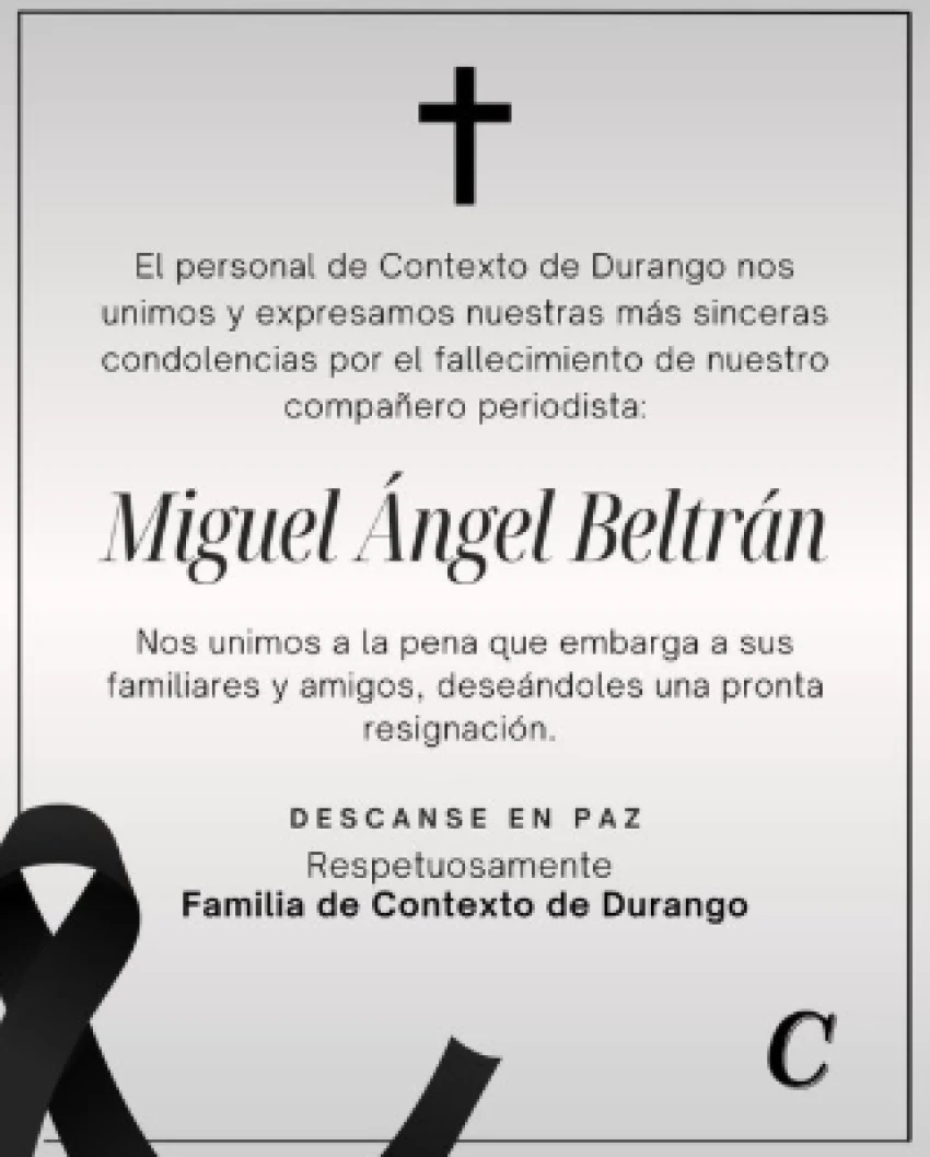 Este domingo se informó sobre la confirmación de la muerte del periodista. Fue el medio de comunicación local Contexto de Durango quien dio a conocer el deceso del comunicador que formó parte de sus filas.