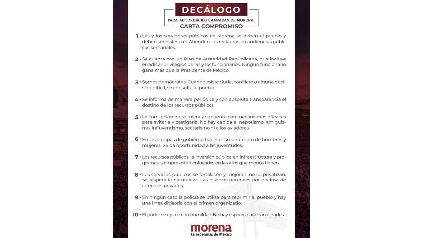 También afirmó que la presidenta Claudia Sheinbaum “ha dicho claramente que cuando es necesario se puede usar” transporte privado, aunque el decálogo de austeridad de Morena —emitido en 2024— establece en su punto número 10 que “el poder se ejerce con humildad y no hay lugar para banalidades”, prohibiendo expresamente el uso de aeronaves privadas.