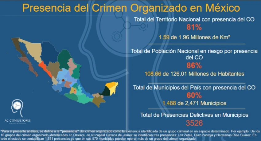 Según un estudio de AC Consultores titulado “Presencia del crimen organizado en México” (2023), más del 80% del territorio nacional se encuentra bajo el control o influencia de 175 organizaciones criminales. Este informe destaca que más de la mitad de los municipios en México están asediados por grupos del crimen organizado.