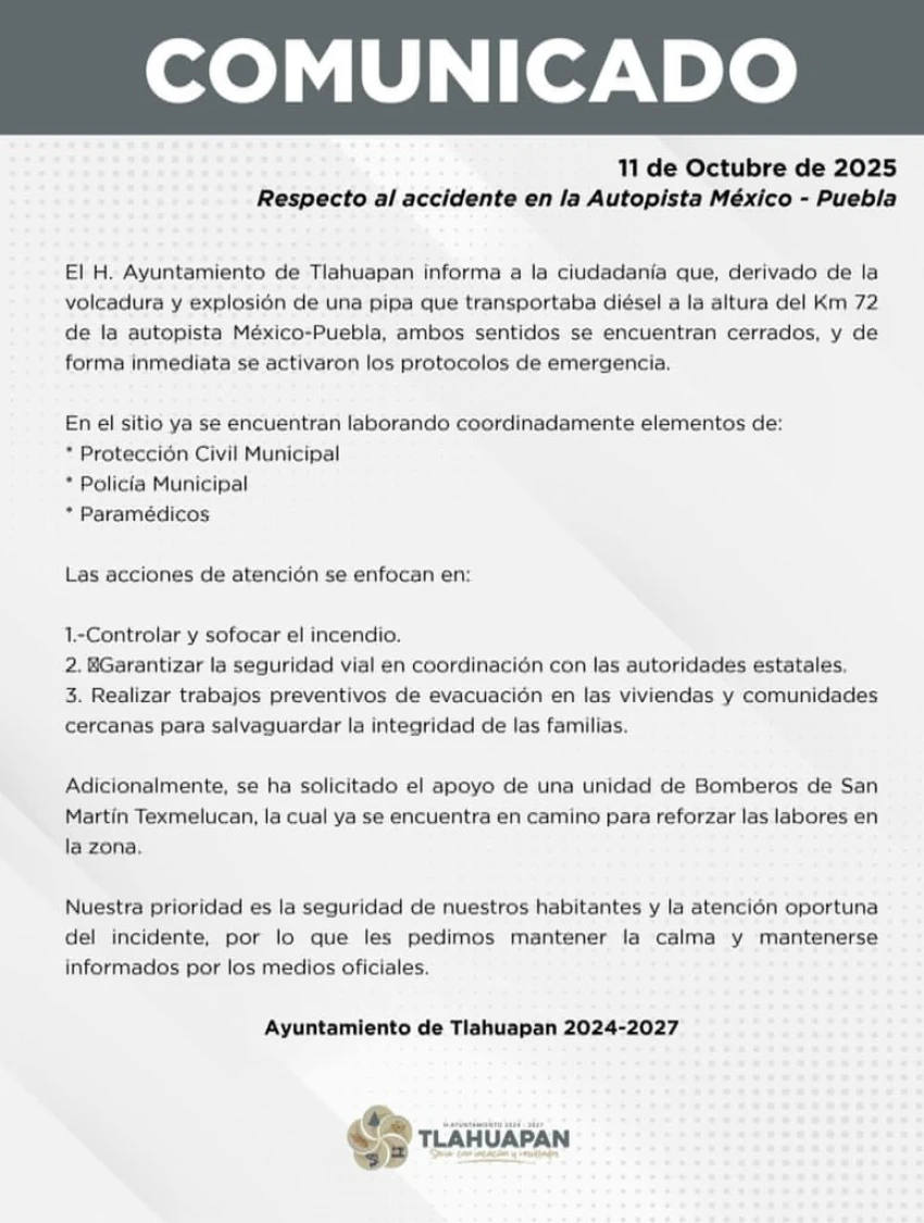 La tranquilidad de la mañana de este sábado 11 de octubre se rompió en la autopista México-Puebla, cuando una pipa que transportaba combustible se volcó y explotó a la altura del kilómetro 72, en el municipio de Santa Rita Tlahuapan, Puebla.