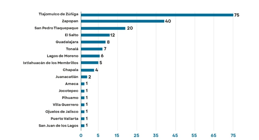 Tlajomulco de Zúñiga: con un total de 75 lugares de inhumación clandestina.