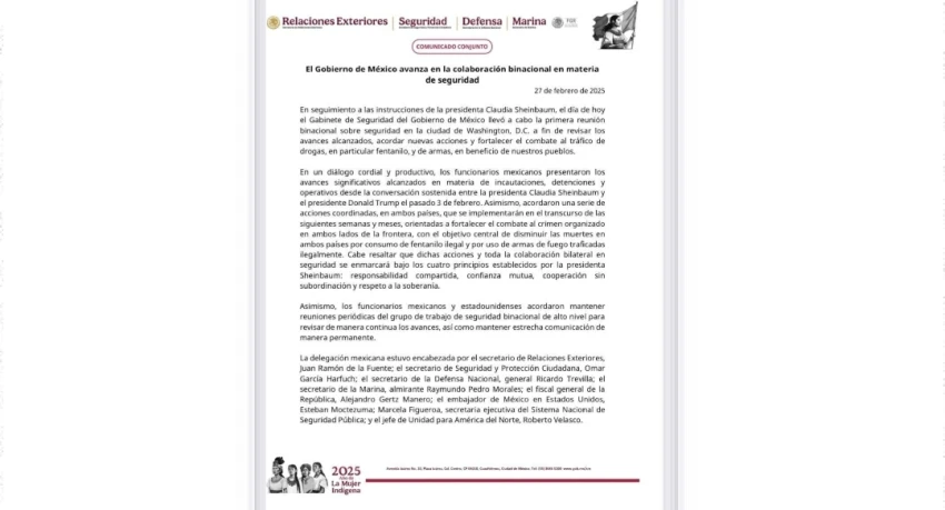 "En un diálogo cordial y productivo, los funcionarios mexicanos presentaron los avances significativos alcanzados en materia de incautaciones, detenciones y operativos desde la conversación sostenida entre la presidenta Claudia Sheinbaum y el presidente Donald Trump el pasado 3 de febrero", se lee en el documento oficial.