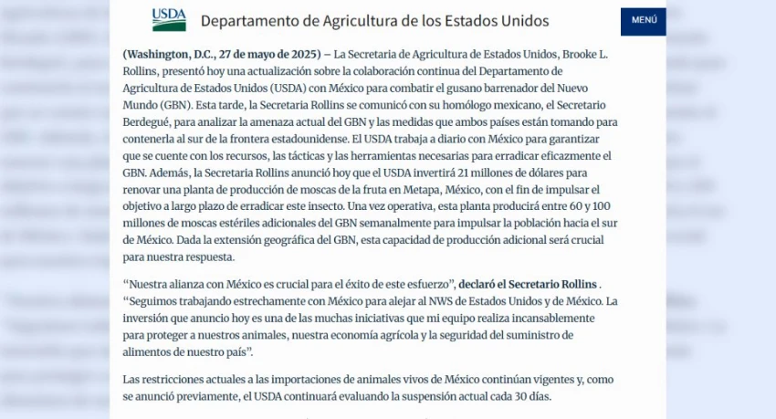 La medida fue confirmada por Brooke Rollins, titular de la Secretaría de Agricultura de los Estados Unidos, quien subrayó que la restricción se mantendrá vigente mientras se revisan los avances implementados por México en el control de la miasis, enfermedad provocada por esta larva.