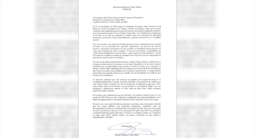 En su carta, Alfredo Gutiérrez Ortiz Mena enfatizó que su decisión de renunciar es coherente con su compromiso con los principios constitucionales. "Hoy me enfrento a una reforma constitucional que acorta el mandato para el cual fui investido. Se me presentan dos opciones: someterme a un proceso de elección popular o presentar mi renuncia. No me considero un candidato adecuado para un cargo que dependa del apoyo popular", escribió el ministro, señalando que su trayectoria y capacidades lo califican para la judicatura, pero no para un puesto que dependa de la opinión pública.