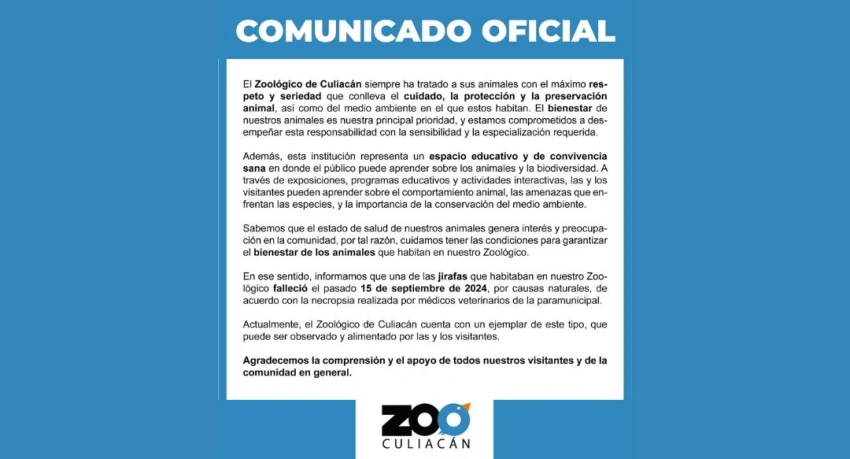 El recinto detalló que la necropsia realizada por veterinarios paramunicipales confirmó que el deceso del ejemplar fue natural. “El Zoológico de Culiacán siempre ha tratado a sus animales con el máximo respeto y seriedad que conlleva el cuidado, la protección y la preservación animal”, indicó el comunicado. Además, destacaron su función educativa como un espacio donde el público puede aprender sobre biodiversidad y convivir con las especies.