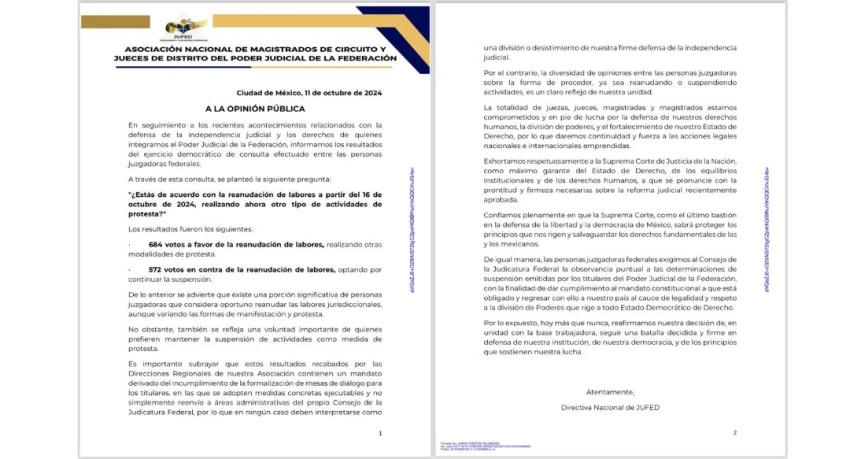 El paro nacional de labores en el Poder Judicial de la Federación (PJF) llegó a su fin tras una votación en la que se obtuvieron 684 votos a favor y 572 en contra de reanudar las actividades jurisdiccionales, según informó la asociación Juzgadoras y Juzgadores Federales. La decisión fue tomada luego de un ejercicio democrático en el que se consultó a jueces y magistrados sobre si se debía continuar el paro o adoptar nuevas formas de protesta.