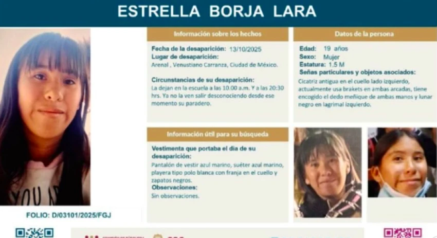 De acuerdo con la información del boletín, Estrella fue vista por última vez en la colonia Arenal, en la alcaldía Venustiano Carranza, alrededor de las 20:30 horas, mientras realizaba su servicio social y actividades académicas.