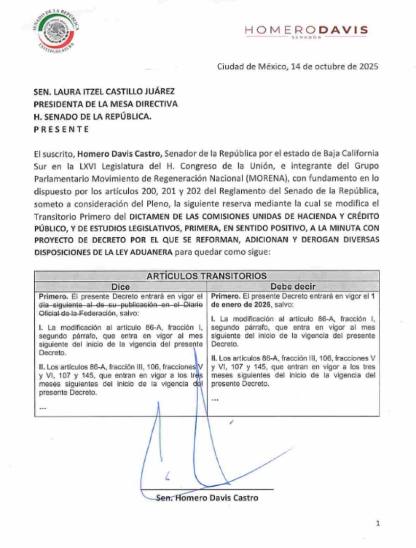 La reforma a la Ley Aduanera que fue aprobada por la Cámara de Diputados el martes 7 de octubre ya tiene fecha tentativa para entrar en vigor, sería para el próximo miércoles 1 de enero de 2026, de acuerdo con el senador Homero Davis Castro quien presentó la reserva.