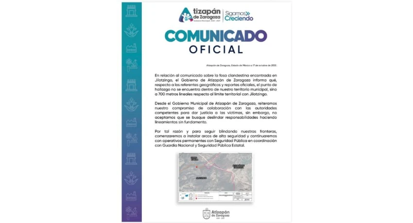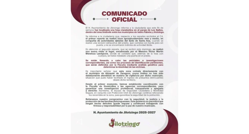 El Ayuntamiento de Jilotzingo reiteró que cooperará en todo momento con la Fiscalía General de Justicia del Estado de México, y que mantendrá informada a la ciudadanía conforme avancen las investigaciones.