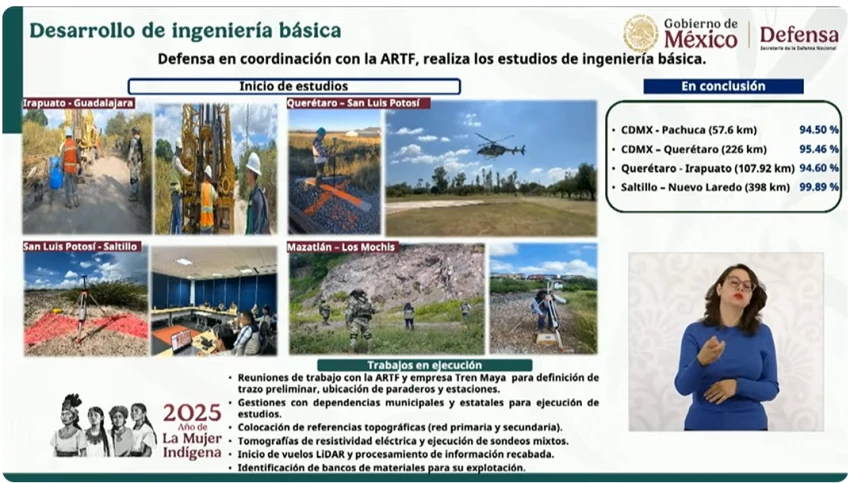 7:54 | Ricardo Vallejo, comandante de ingenieros del Agrupamiento Felipe Ángeles, dijo que la Defensa participa en la construcción del tren de CDMX a Pachuca y de CDMX a Querétaro, además de que construyen trabajos de ingeniería básica de Qro. a Irapuato y de Saltillo a Nuevo Laredo.