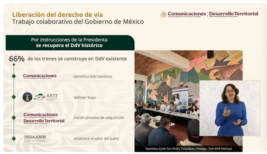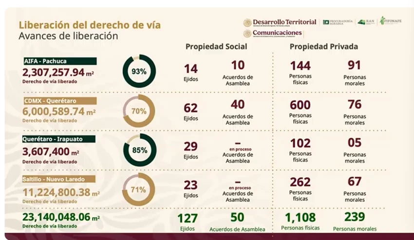 Dijo que en cuanto a la fase de tierra a liberar y mecanismos de adquisición la instrucción de la presidente es que los pagos se hagan de manera directa. Indicó que van 1,600 predios liberados.