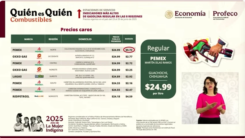 Gasolina regular más cara: en 24.99, Pemex en Guachochil, Chihuahua.