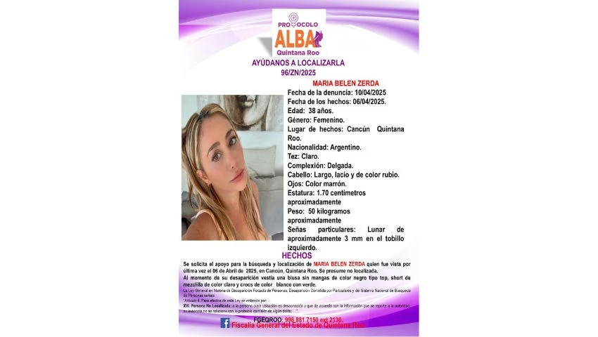 La Fiscalía General del Estado de Quintana Roo informó que la turista argentina María Belén Zerda fue localizada con vida, luego de 12 días de reportarse su desaparición en Cancún. Zerda, de 38 años, había escapado a la selva sin motivo aparente. Según versiones cercanas, padece esquizofrenia, aunque su familia niega esta versión.