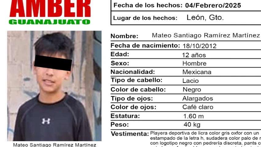 Después de tres días de intensa búsqueda, Mateo Santiago Ramírez Martínez, de 12 años, fue encontrado sin vida en las inmediaciones el Rancho La Atarjea, en la población Lagunilla, a la altura del kilómetro 3 de la carretera León-Lagos de Moreno, en los límites de Jalisco y Guanajuato, dentro del municipio Lagos de Moreno, según la información de la Fiscalía de Jalisco.