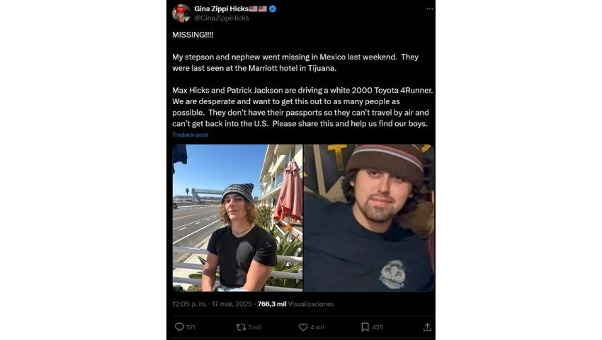 Se trata de Max Hicks y Patrick Jackson, ambos de 21 años, quienes fueron vistos por última vez en el hotel Marriott de Tijuana. De acuerdo con la denuncia pública hecha por Gina Zippi Hicks, madrastra de Max y tía de Patrick, los jóvenes viajaban en una Toyota 4Runner blanca, modelo 2000.